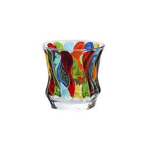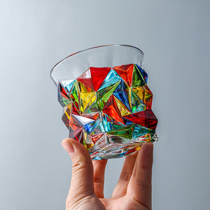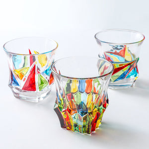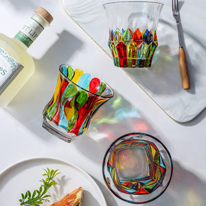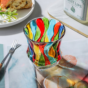 Our delicately glasses are made of hand-blown glass in a spectrum of colors. Talented artists blast molten solid-color glass into a stacking form, resulting in textured, tactile glasses. Stack many glasses in the same color for a matched bar cart, or collect one of each to keep track of who's drinking what.