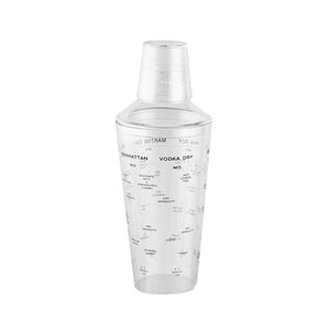What do you get when you combine a favorite drink with a unique reciped shaker? Cocktails are fashionable again, so utilize this helpful barware addition to draw attention to your restaurant, specialty liquor, or brand. The set includes a mixing tumbler, an ice strainer, and a jigger cap. Clear polycarbonate material is used. Remarked with various recipe indicators to make combining a snap.