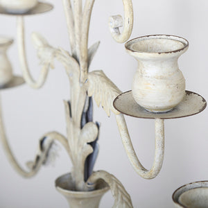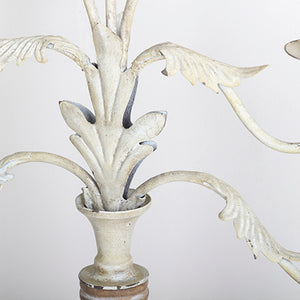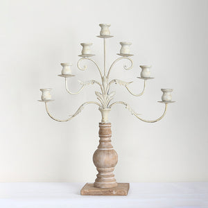 The tall, distressed Iron-Wood Candelabra with Ace Designs by Beit Collections Decor adds antique-style scrollwork and ambient lighting to your house. It has an antique white finish with distressing for a vintage effect and holds 7 taper candles.