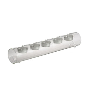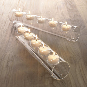 This beautifully curving glass tealight centerpiece cylinders its way down the middle of a dining room table, inspired by the distinctive design of a bow tie. Five spherical concaved bases with delicate shades sit atop, holding five tealights. The glass centerpiece's luxuriously gleams beautifully in the light of flickering real or flameless tealights.