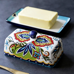 This adorable dish brings a touch of whimsy to the table by serving a stick of butter. This small, lidded dish is made of white stoneware with coloring underglaze and can be easily moved around the table. Place multiples down the middle of a long table for large family feasts and holiday get-togethers so that every diner has a butter dish within reach.