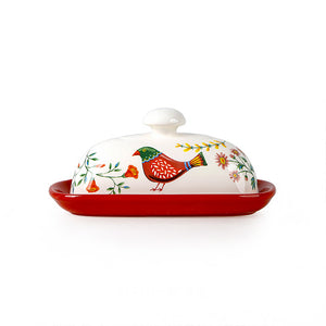 This adorable dish brings a touch of whimsy to the table by serving a stick of butter. This small, lidded dish is made of white stoneware with coloring underglaze and can be easily moved around the table. Place multiples down the middle of a long table for large family feasts and holiday get-togethers so that every diner has a butter dish within reach.