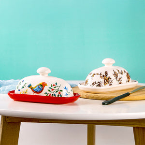 This adorable dish brings a touch of whimsy to the table by serving a stick of butter. This small, lidded dish is made of white stoneware with coloring underglaze and can be easily moved around the table. Place multiples down the middle of a long table for large family feasts and holiday get-togethers so that every diner has a butter dish within reach.