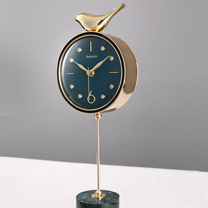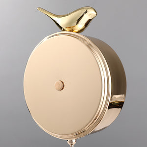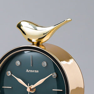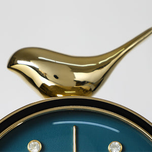 This is a Nordic European style of gold bird marble clock with the body of bronze alloy and marble as the base with a lovely bronze bird sitting on the clock. Only showing the large number of six and 3 interesting pattern line of three, nine and twelve while others are the piece of diamond like rhinestone scale decorative. Its luxury design allows it to be one of the best collection to decorate your house and your Nordic style. It is to decorate and upgrade your rooms to a higher level of Nordic style.
