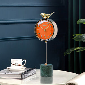 In order to accompany you day and night, it must be having some interesting parts, a body made of alloy bronze, a Nordic's product main material, golden bird on top of the clock, gold iron as clock's hands and make you feel likes in the paradise. Not just these, more than you expected with a circular marble base and a column connect the clock. This is good enough for you to decorate the modern simple minimalist and Nordic style of interior design. It is suitable to place in any places you like to increase the scenes of beauty such as your living room, kitchen, bedroom and villa. There are 3 choice of the clock, white shell with the leather cover around it or leather dark slate gray or leather orange red.