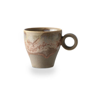 Our Half-Chen mug's clean, classic design draws attention to the lovely warm tone reactive glazing. The glaze produces one-of-a-kind patterns and brilliant, varied warm wavy turbulent colors with taupe undertones as it undergoes chemical changes during fire. The glaze changes from creamy sandy surface, speckled with distinct marks and crackles. This desired crazing occurs during the firing process, and the craquelure can become more complicated over time as the raw natural materials expand and shrink. The glaze and its effects are food-safe, however certain foods may cause it to discolor briefly.