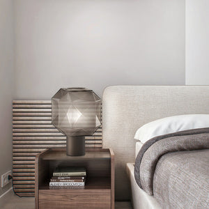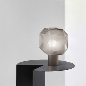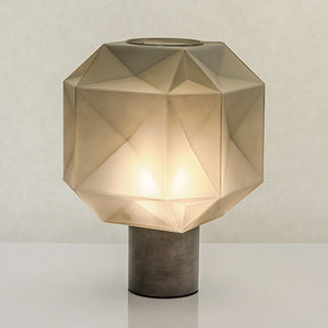 Kreskes desk lamp, a clean and sophisticated style for this glass lamp. The simple construction allows the beauty of the materials to shine through. The smoky gray hue gives way to the transparency on the abstract geometric glass lampshade.