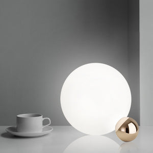 Fera table lamp is made with the highest quality material and with authentic design, delightful pairing of simple orbs that are perfectly compatible in balance and structure, embodying a stylish object of light. Although the two difference in size greatly, the smaller aluminum base is able to support the larger hand-blown glass diffuser. The orb shape glass is discreetly leveled at the base to ensure stability of the table lamp, sitting comfortably on table tops as a decorative piece of illumination.