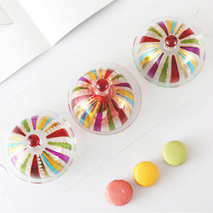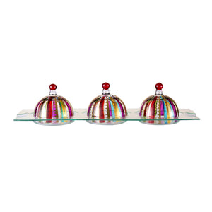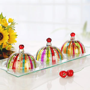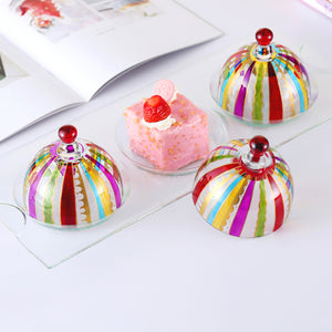 Cakes, fruits, and cheeses are protected by a clear, handcrafted glass dome. This unique cloche presents appetizers and sweets stylishly while also protecting and keeping them fresh. The dome's inbuilt reddish glass knob makes it simple to remove. Each glass dome will be somewhat different in shapes and drawn patterns due to its handmade nature.