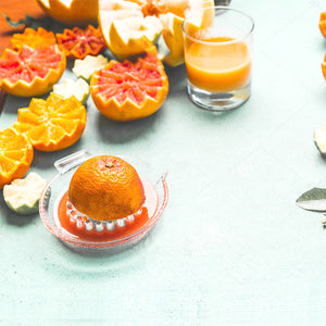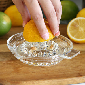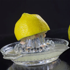 This vintage juicer, inspired of Italian design with sturdy pressed glass, conveniently squeezes fresh juice from lemons, limes, oranges, and grapefruits. Simply place a half of a lemon on the reamer and twist. The large reservoir contains lots of juice, and the glass teeth separate the seeds.