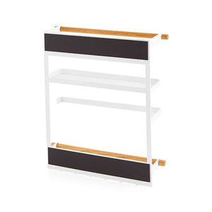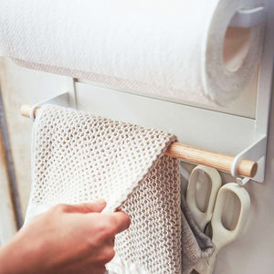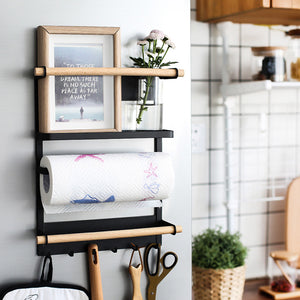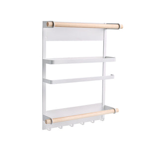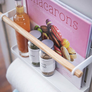 This airy and space-saving magnetic kitchen organization rack makes the most of unused space. Strong magnets adhere to the fridge, allowing you to keep your most-used ingredients and tools close at hand. Spices and cookbooks are stored on a shelf, a paper towel roll is supported by a bar, and utensils and oven mitts are hung from hooks. Two wooden rods provide additional utility, with the upper bar keeping items safe on the shelf and the lower bar holding a tea towel, which contrasts warmly with the glossy white finish. The sturdy steel rack, which is inspired by Scandinavian design, can be mounted to a wall or the inside of a cabinet door to maximize storage.