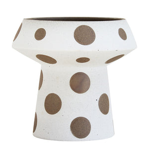 Wooken planters have artisanal texture thanks to hand-shaped dots. The planters, which are elevated on one-sided pedestals, allow for a clearer view of the plants; also are standing like a gourd vase on another wider side. Natural warm hue contrasts sharply with cultivated greenery. To create a tiered botanical show, group our Wooken vessels together.