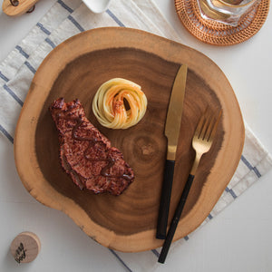 Each thick wedge of acacia tree exhibits a distinctive whorl of vibrant interior grain for natural serving with a rustic touch. Handcrafted and finished with vegetable oil.