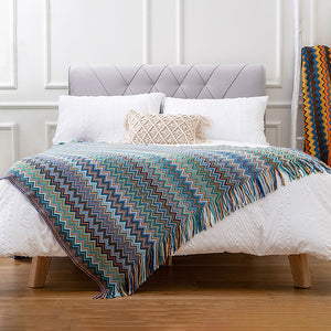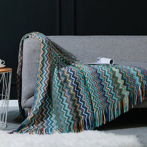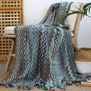 This multicolored throw's handwoven stripes offer a stunning combination of hues and textures. When contrasted with red, green, yellow stripes, rows of subtle brown, blue, indigo, gray and orange pop, all accentuated with a hint of colorful thread. The fringes on the blanket's opposite ends reveal all of the threads that have come together to form the lovely and warm completed product.