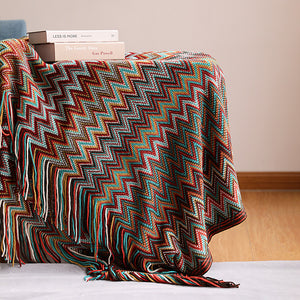 This multicolored throw's handwoven stripes offer a stunning combination of hues and textures. When contrasted with red, green, yellow stripes, rows of subtle brown, blue, indigo, gray and orange pop, all accentuated with a hint of colorful thread. The fringes on the blanket's opposite ends reveal all of the threads that have come together to form the lovely and warm completed product.