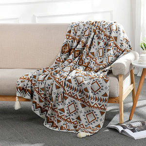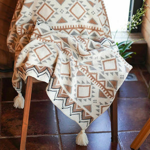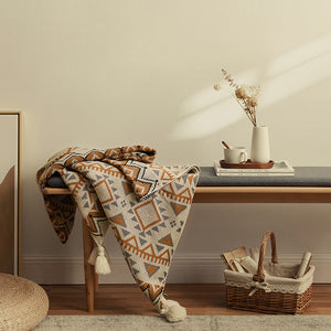 Textured bohemian throw blanket with linear striping that adds richness to your warm space. The corners are trimmed with tassels.