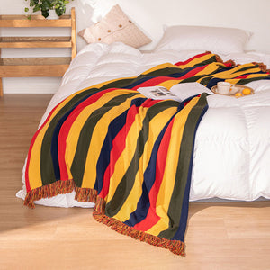 This throw features sunset stripes, which is our most popular design. A bright and brilliant combination of hues that will make it stand out in any room. And, of course, this blanket is incredibly cozy! It's ideal for creating your own unique happy space. Sheared to give it that soft plush feel, it was woven using the best European yarns.