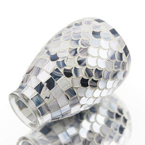 This glass mosaic vase is a one-of-a-kind piece. Stained glass was used to create this piece. It's reflecting, and when light reflects off of it, it creates a lovely shadow. Place it on a nightstand, your desk, or in the bathroom.