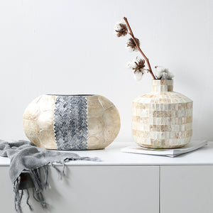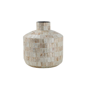 In our Maxine mosaic vase, softly textured marble tiles turns antiques mood. For a natural shaping, a long, slim lip tops the round vessel. Show as a glimmering object of art on a bookshelf or mantel, or fill with a lush arrangement of real or fake botanicals. Our mosaic vase from Maxine is an exclusive contemporary piece of antique art.