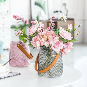 With this glass vase with a handle, you can add a splash of color as well as usefulness to your modern design. It has a large bowl made of semi-transparent glass that may be hung or carried with the help of the faux leather handle. This vase provides a lush backdrop for floral arrangements.