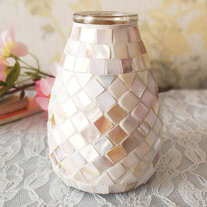 This glass mosaic vase is a one-of-a-kind piece. Stained glass was used to create this piece. It's reflecting, and when light reflects off of it, it creates a lovely shadow. Place it on a nightstand, your desk, or in the bathroom.