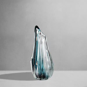 Waves of colored glass are manipulated and encased in clear glass crystal to give these hand blown glass vases a flowing quality. The lip is sculpted to accentuate the color swirls. Because of the inherent nature of traditional glassblowing, each piece is a unique piece of art. No molds are used in the creation of this work.