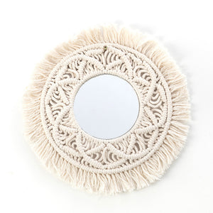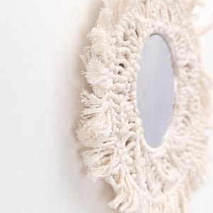Boho-inspired hanging mirror featuring a round, frameless design hung in a macramé edge with a feather accent and intricate knotting extending up to the loop ring. Woven mirror suits homes with global, bohemian or nordic organic style.