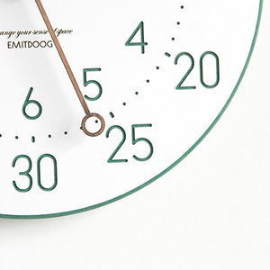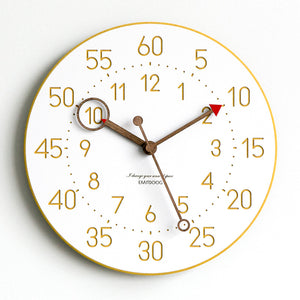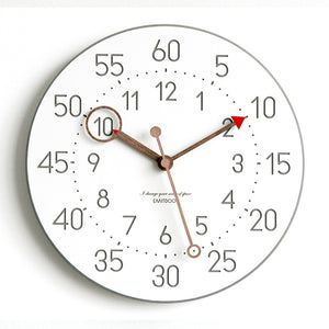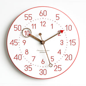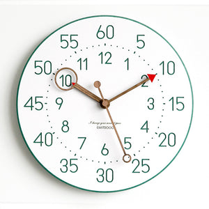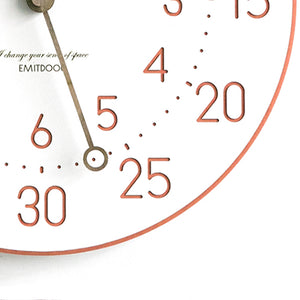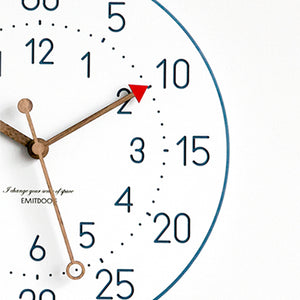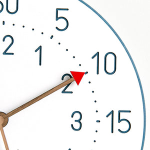 This is a 12 inches Nordic color minimalist children wall clock, the clock body made of environmental friendly forescolor MDF with 3 walnut wooden clock's hand. The clock face is clean and just white color with the very clear orderly arrangement of every seconds, minutes and hours. The clock separate into a 3 ring. The outermost ring is the 5 minutes or seconds interval, middle ring is the dots for every seconds and mini pattern lines align with the 5 interval, innermost ring is the arabic numeral for hours.