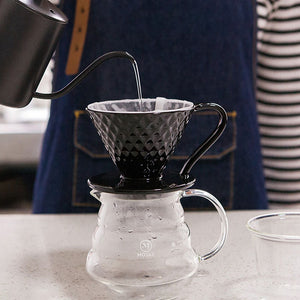 The ceramic drippers are made of Arita-yaki in the town of Arita, a 400-year-old traditional Japanese ceramics type. Each dripper is handcrafted by a local artisan and combined with its practical elegance, creates a breathtaking contrast between tradition and modernity. The V60's conical shape allows for more coffee grounds to be layered, and the spiral ridges and lack of flow restriction enable you to pour the water quickly for a delicate body or slowly for a stronger flavor.