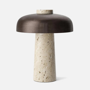 Spess table lamp play on structure created by geometric constraints, the conical travertine base and curved, bronzed shade define the lamp’s perfectly balanced expression.